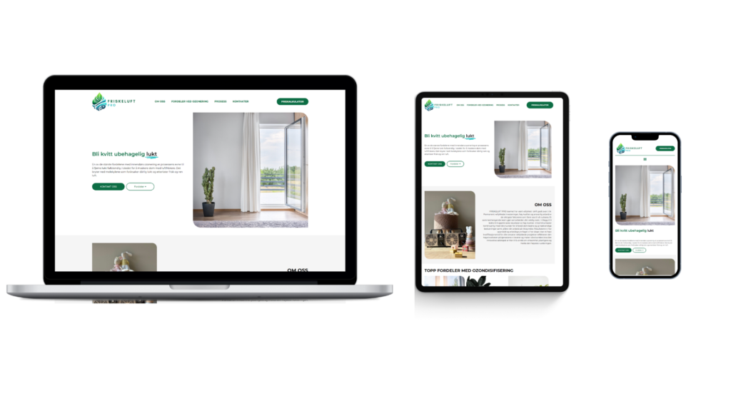 Dirbant prie „friskeluft.no“ svetainės pagrindinis tikslas buvo sukurti patogią ir modernią platformą, pristatančią ozonavimo paslaugas, skirtas oro kokybės gerinimui ir kenksmingų mikroorganizmų šalinimui. Svetainėje akcentuojamas efektyvumas ir inovacijos, o vartotojams suteikiama galimybė lengvai apskaičiuoti paslaugų kainą naudojant integruotą skaičiuoklę. Švarus dizainas ir intuityvi struktūra užtikrina malonią ir aiškią vartotojo patirtį.